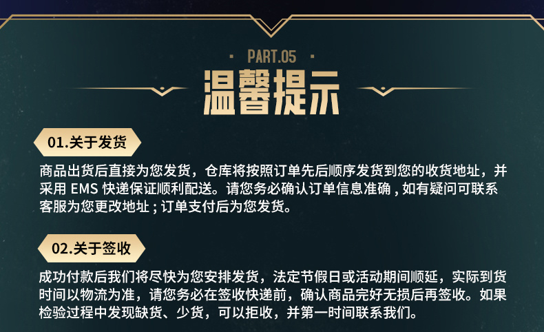 4、发货时间将在尾款页面进行提示,如有变动将另作补充说明。