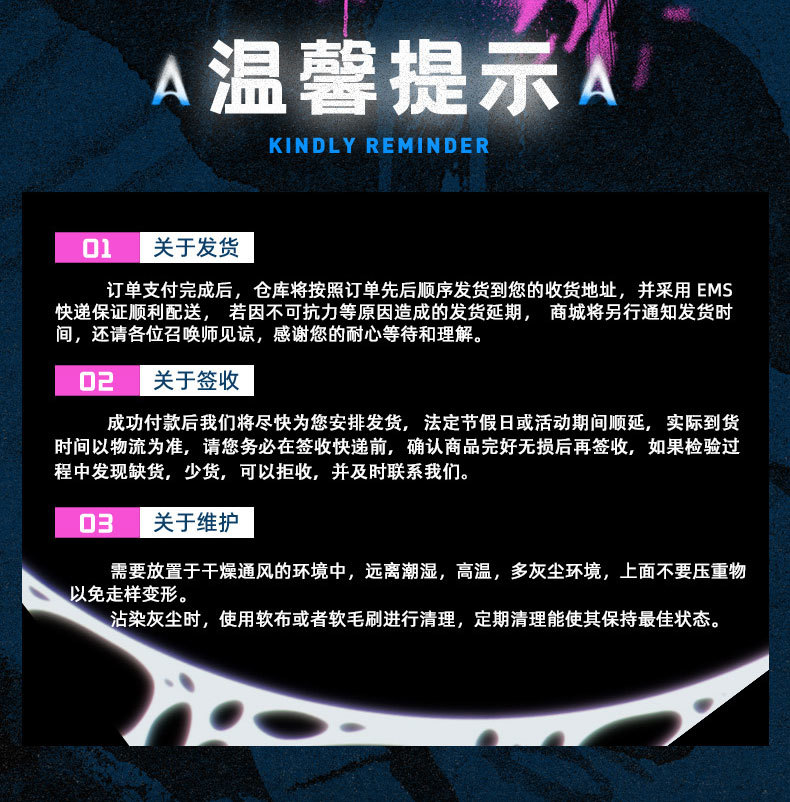 3、关于发货:由于产品设计及生产存在不确定性,我们将在收取尾款时公示具体发货时间,如有变动将会另作补充说明。