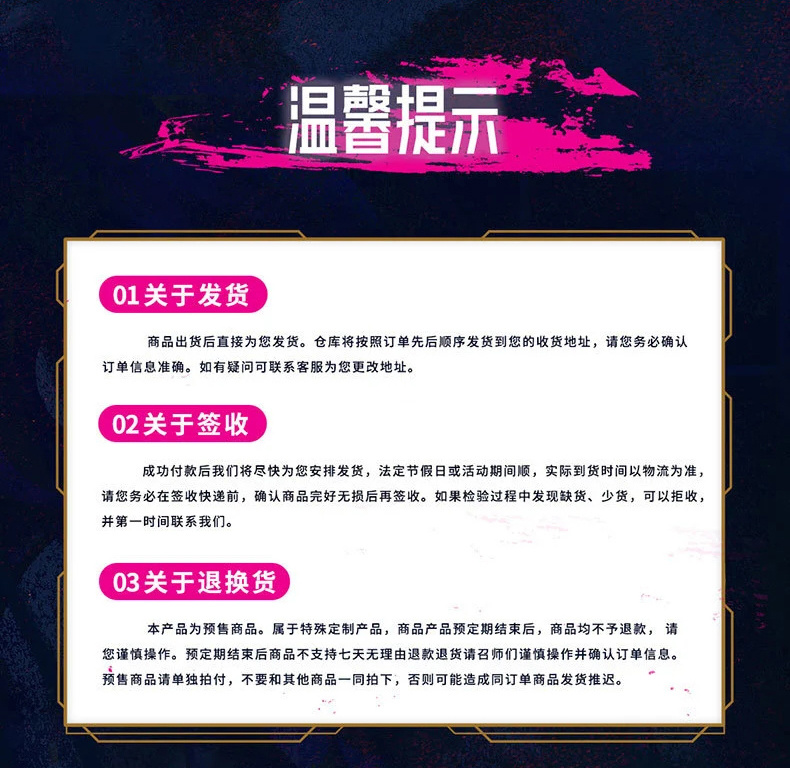 4、发货时间将在尾款页面进行提示,如有变动将另作补充说明。