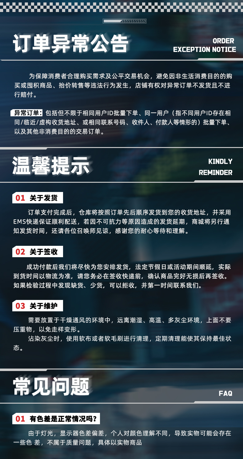 4、发货时间将在尾款页面进行提示,如有变动将另作补充说明。