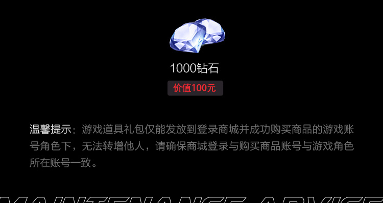 购买即赠1000 绑定钻石,虚拟道具属于特殊商品,暂不支持退货服务,敬请谅解。
